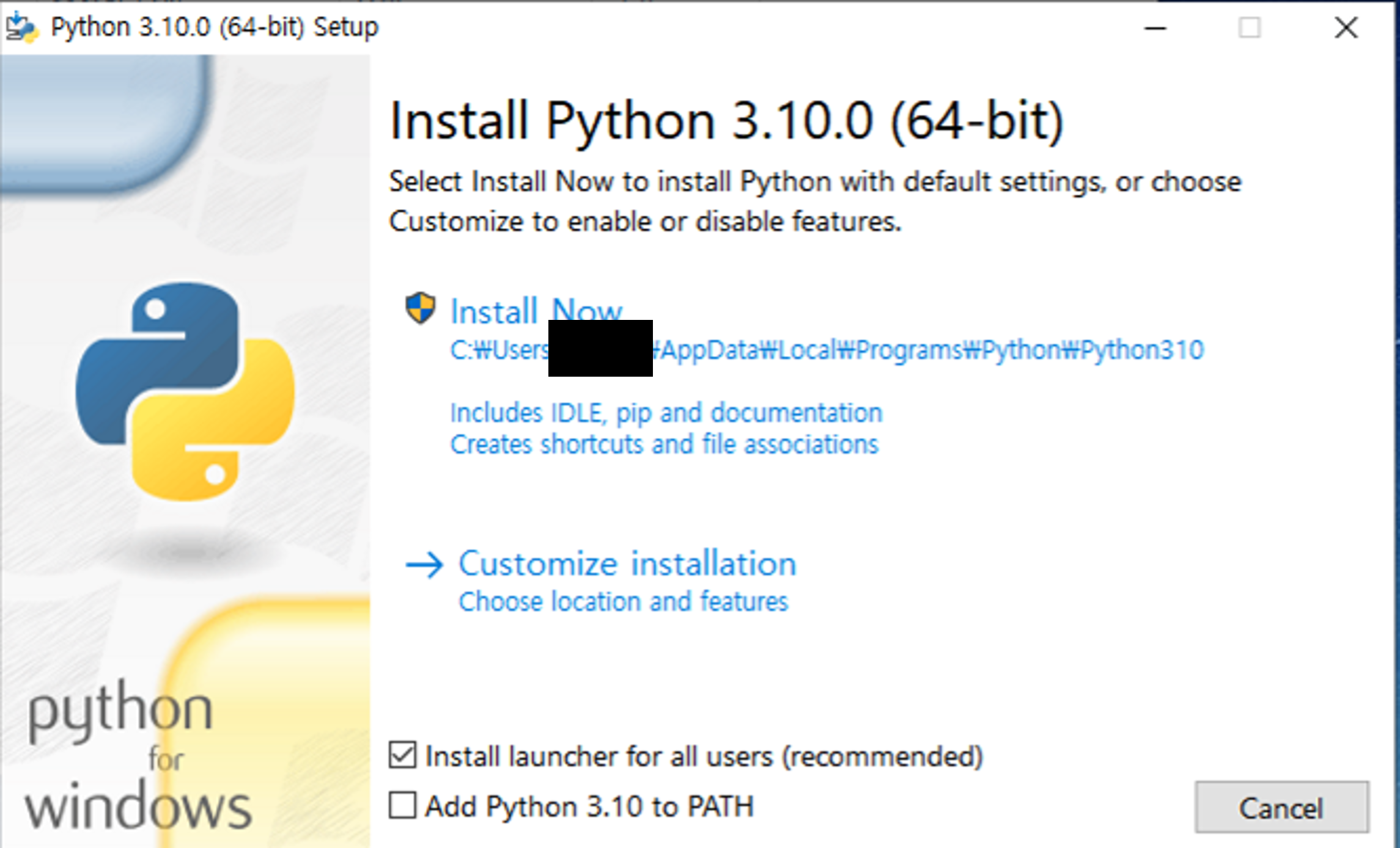 만약 체크를 못하면 명령어 실행시 오류가 발생할 확률이 굉장히 높습니다. 그때는 환경변수를 일일이 추가해 줘야하는데, 그럴바에는 파이썬을 삭제하고 재설치 하는게 빠르다고 할 정도니까 꼭 체크해 주세요!