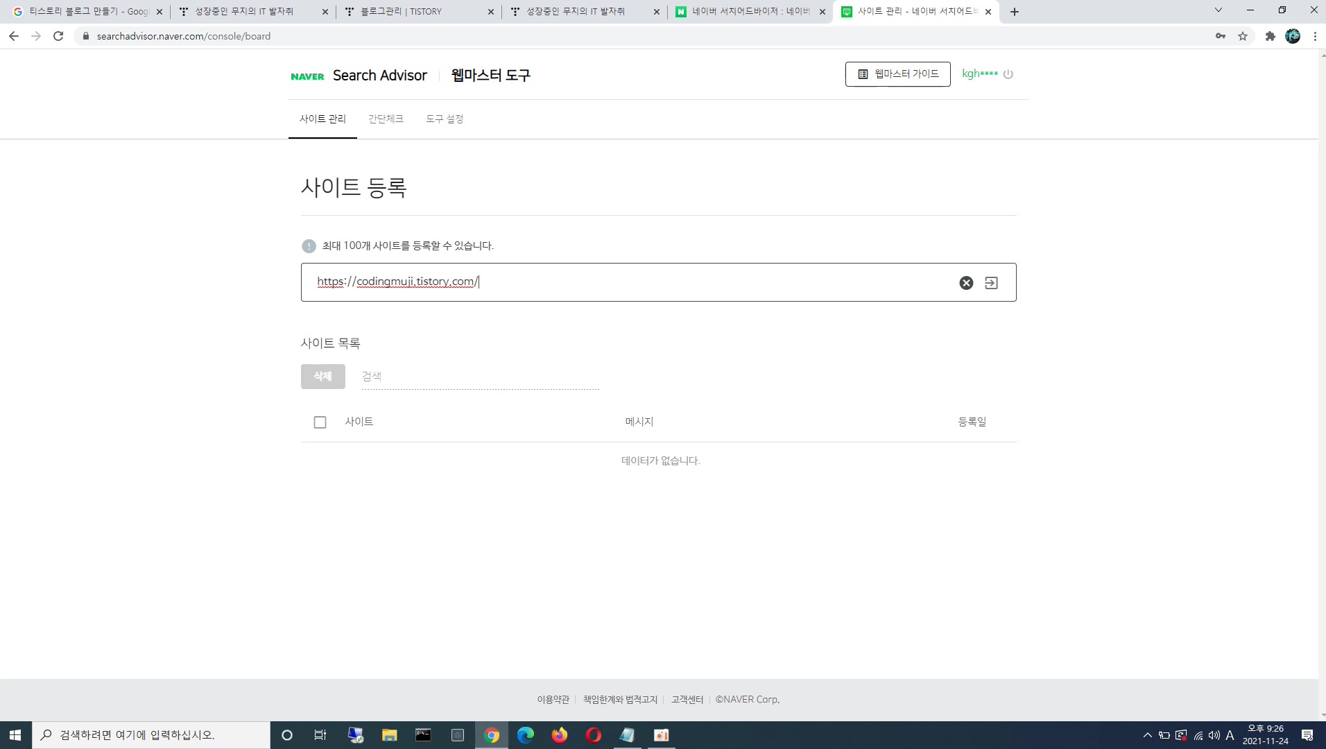 이제 사이트 등록을 진행해 줄 거예요. '이곳에 URL을 입력해주세요.' 입력 영역에 자신의 티스토리 URL을 입력해 주세요.( ex. http://codingmuji.tistiry.com/)
