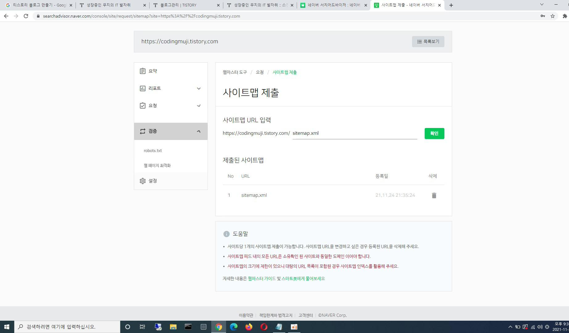 사이트맵 URL 입력 영역에 'sitemap.xml'을 입력해 주시면 됩니다! 그리고 [확인] 버튼 눌러주세요!