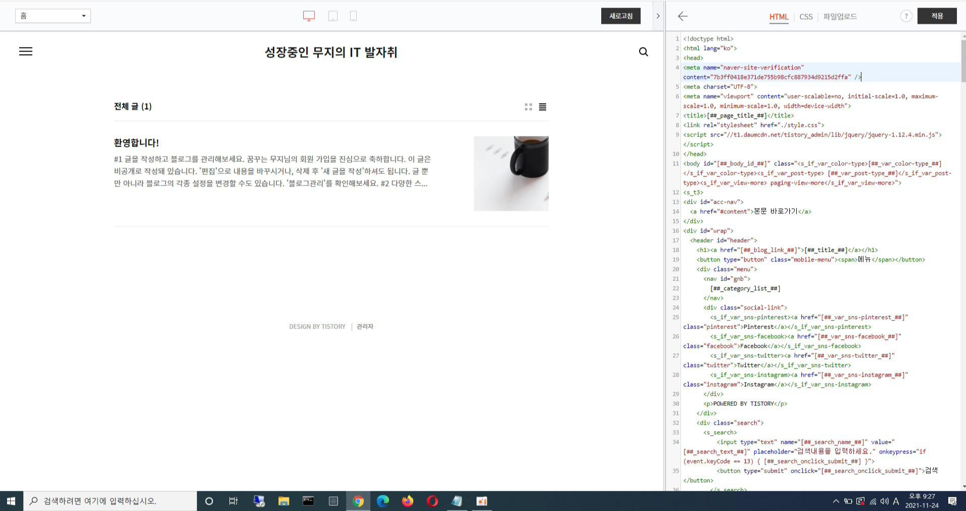 | 2021.11.25) Tistory 블로그 시작하기 (2) | 2021.11.25 |